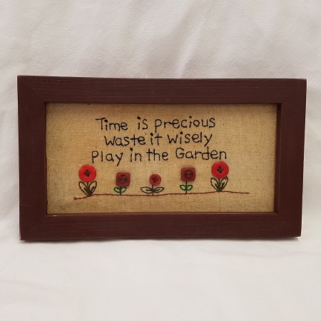 5.25″ x 9.25″ – A hand stitched picture with primitive wooden frame and glass cover.